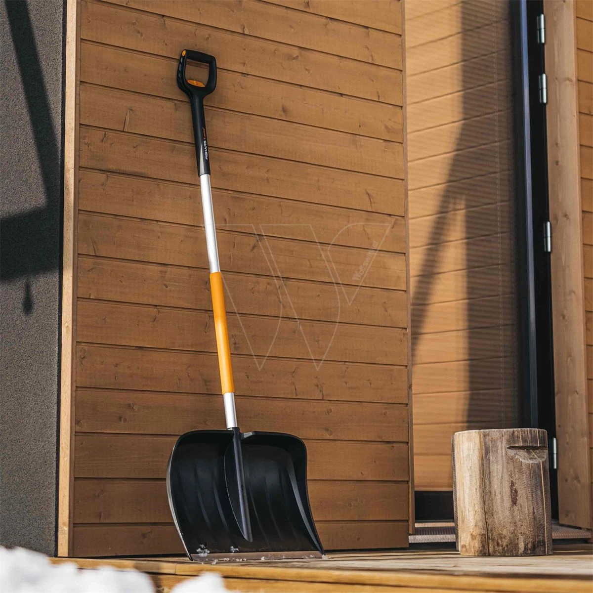 - De Fiskars X-serieâ„¢ telescopische sneeuwruimer heeft een breed blad en instelbare handgreep voor het gemakkelijk en ergonomisch ruimen van sneeuw op opritten en paden