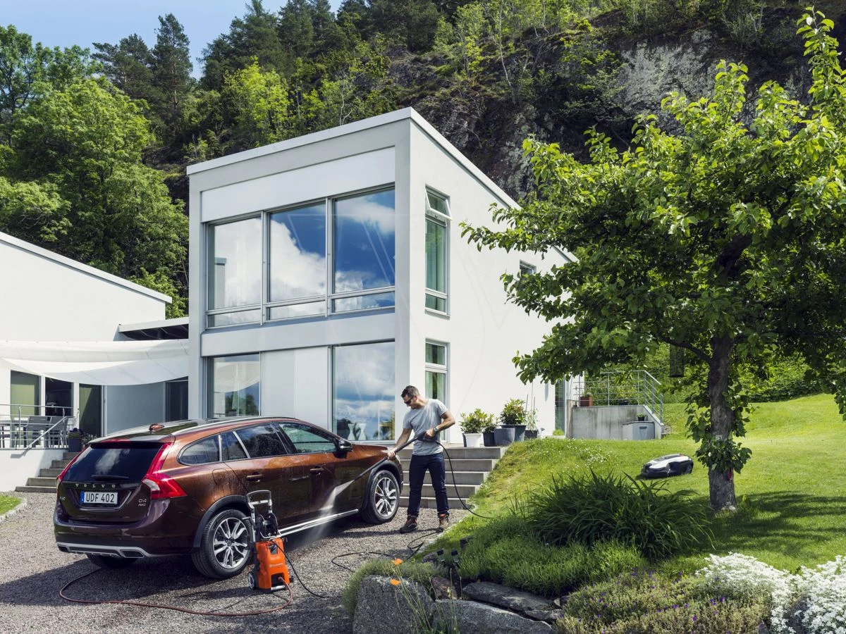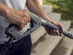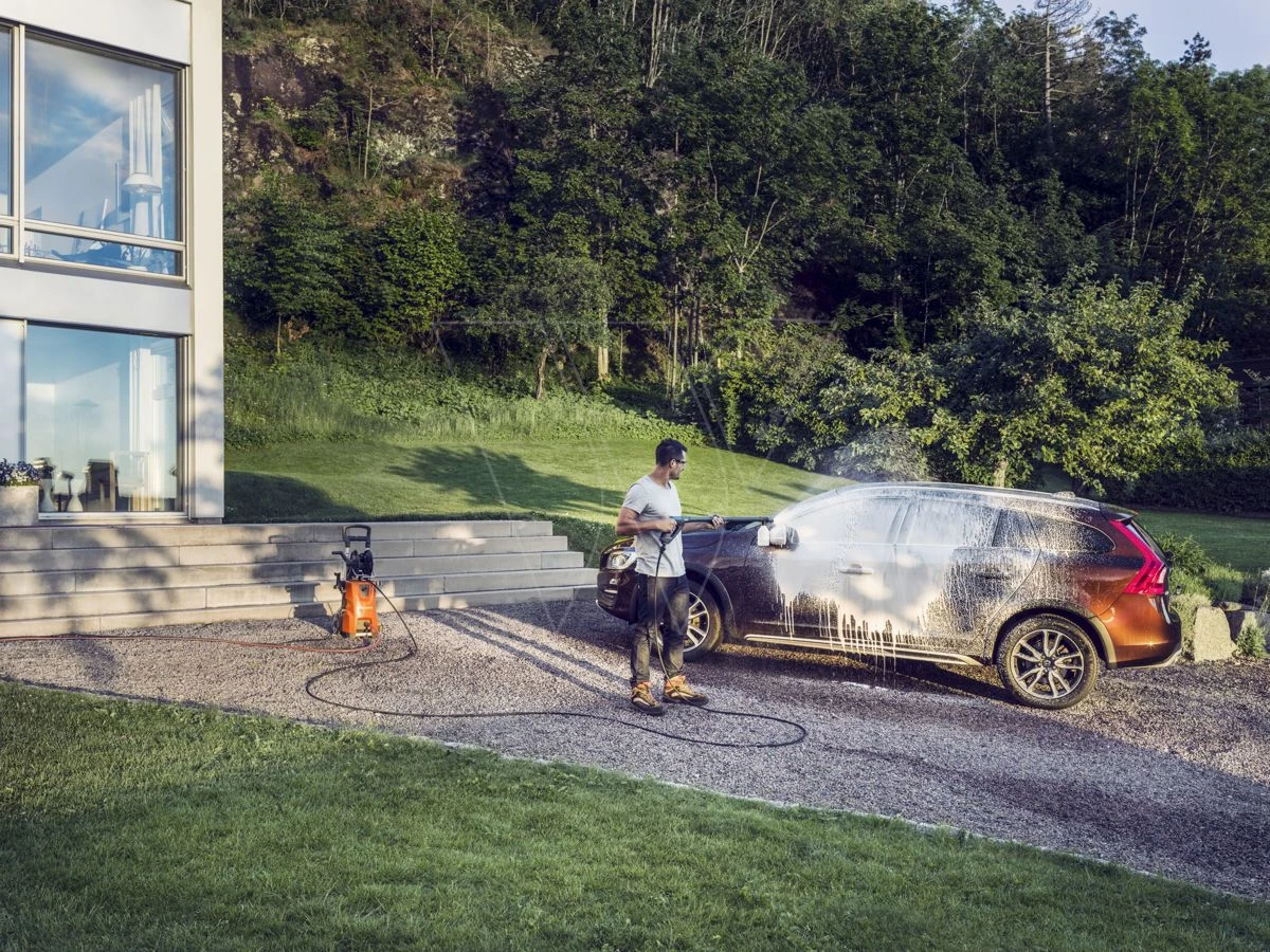 Een echt goed presterende machine met een robuust en doelgericht ontwerp, voor uitstekende resultaten en veeleisende taken zoals voertuigen en stenen muren. Een met staal versterkte hogedrukslang is inbegrepen.